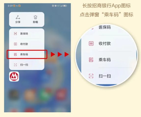 招商银行广州分行持卡用户,长按招商银行APP图标,点击弹窗【乘车码】图标,并点击相关活动页面即可参与。首次开通地铁乘车码可领8元地铁立减券,每笔立减2元,有效期7天。