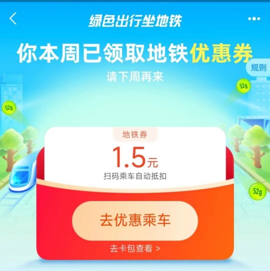 支付宝APP内搜索【出行】,依次点击【出行优惠】-【地铁】-【领最高10元地铁乘车券】参与活动,用户每周可领取1次随机数额的地铁优惠券,包含以下几种类型:①0.05-10元面额优惠券1张:不同面额券可使用1-10次不等,单次最高优惠10元。②最高1元优惠券1张:享折扣优惠,一次性使用。