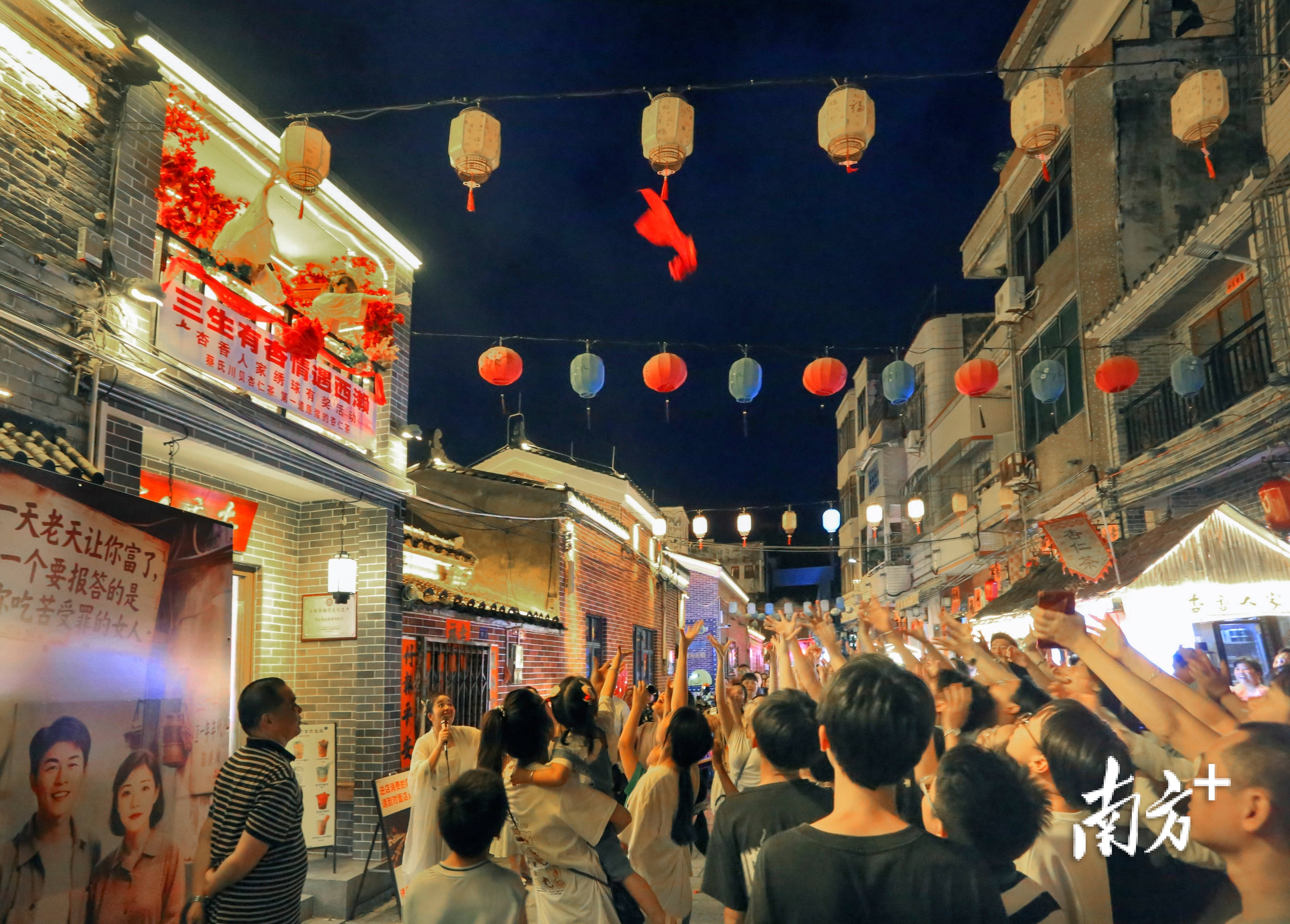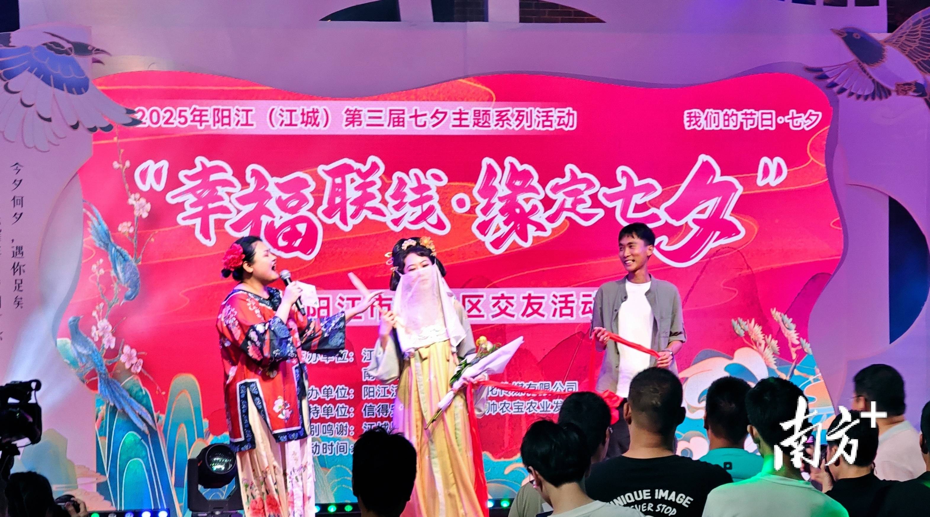 晚上7时半,在西濑风情景区一号公园首先登场的“抛绣球说媒”相亲活动瞬间点燃现场气氛。三位媒婆登台主持,复刻古代“绣球定姻缘”民俗,现场单身男女踊跃参与,在欢笑中感受七夕“牵红线”的甜蜜,赢得现场阵阵欢呼声。