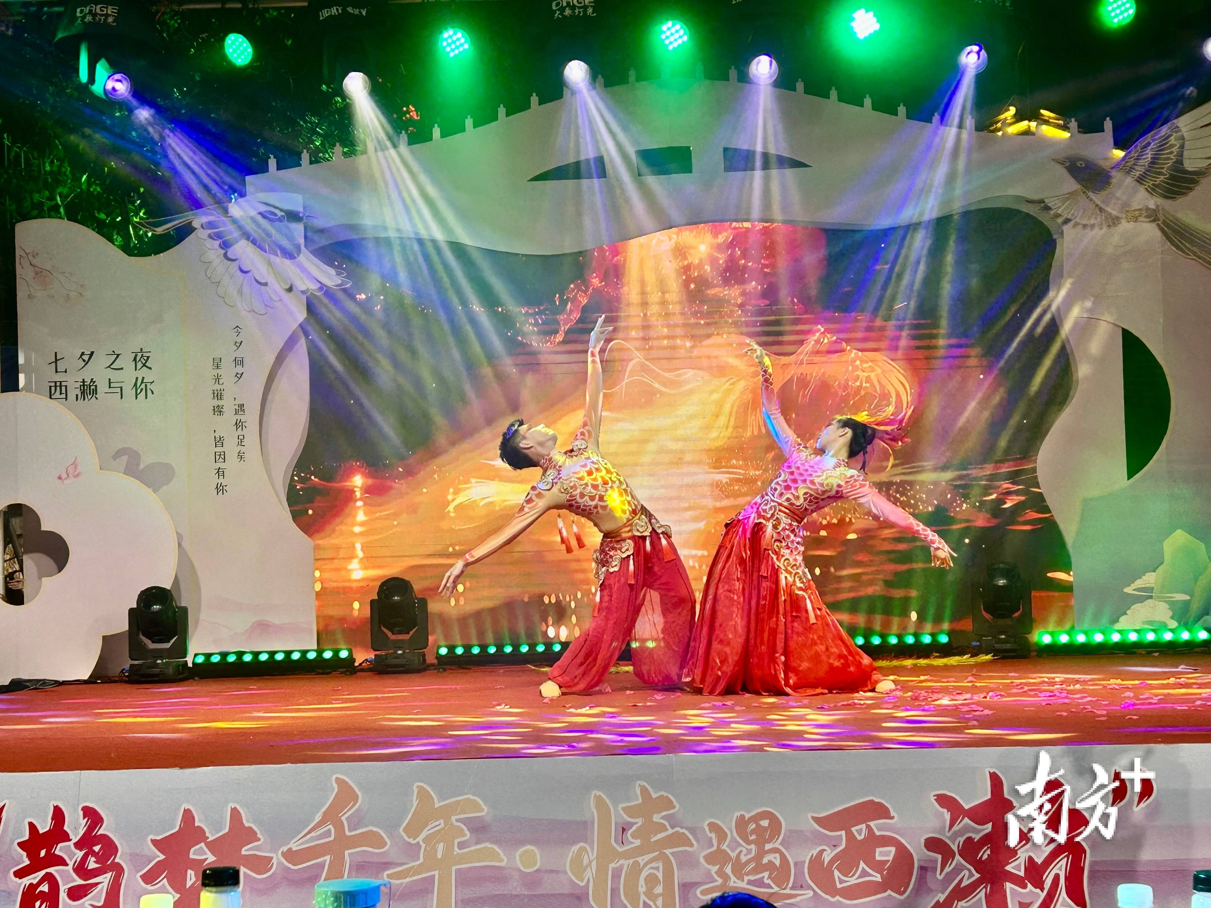紧接着,气势恢宏的醒狮表演、本土原创歌曲《西濑》的倾情演唱拉开了晚会帷幕。随着“‘鹊梦千年·情遇西濑’2025阳江(江城)第三届七夕主题系列活动开始!”的宣布,浪漫之旅正式开启。
